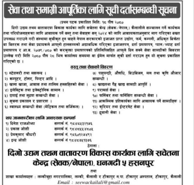 सेवा तथा सामग्री आपूर्तिका लागि सूची दर्तासम्बन्धि सूचना